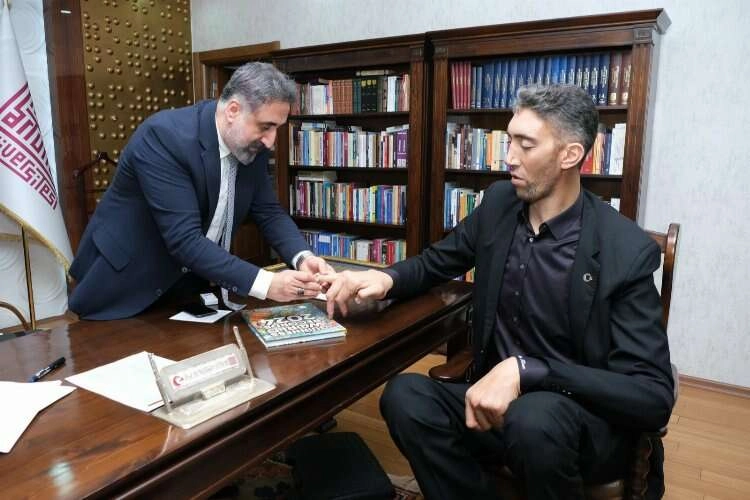 Kendisi için özel tasarlanan ve Mardin Artuklu Üniversitesi telkari atölyesinde üretilen yüzük nedeniyle teşekkürlerini ileten dünyanın en uzun insanı Sultan Kösen, 15 yıldır elinde tuttuğu dünyanın en uzun boylu insanı unvanıyla yeniden yer aldığı 2024 Guiness Rekorlar Kitabını Rektör Özcoşar’a hediye etti.